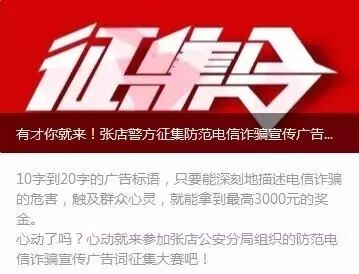 为有效提高市民对电信诈骗的防范意识,此前张店公安分局举办了防范电信诈骗宣传广告语征集大赛。消息一经报道,市民参与热情高涨,近2000名市民踊跃参与。此次活动共征集到广告语上万条,其中不乏朗朗上口、直击心灵的佳作。